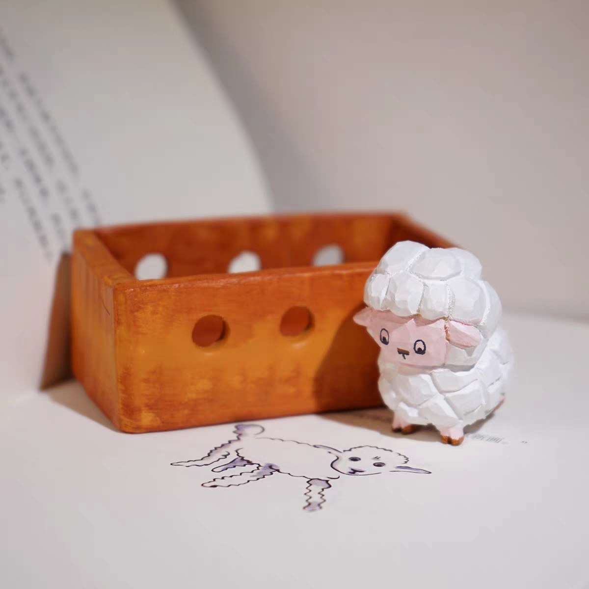 小小綿羊與木箱都由職人以楓木手工雕刻、上漆完成。