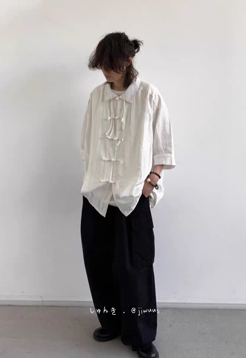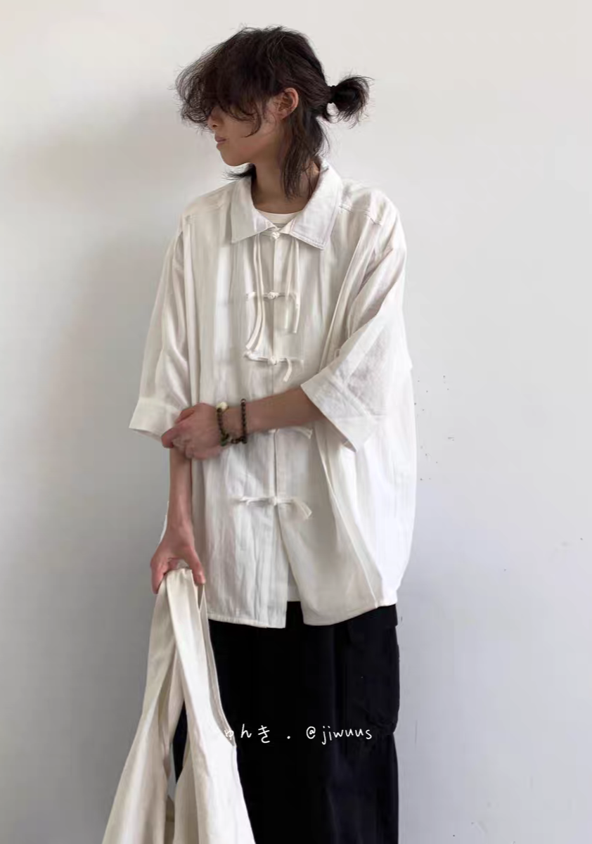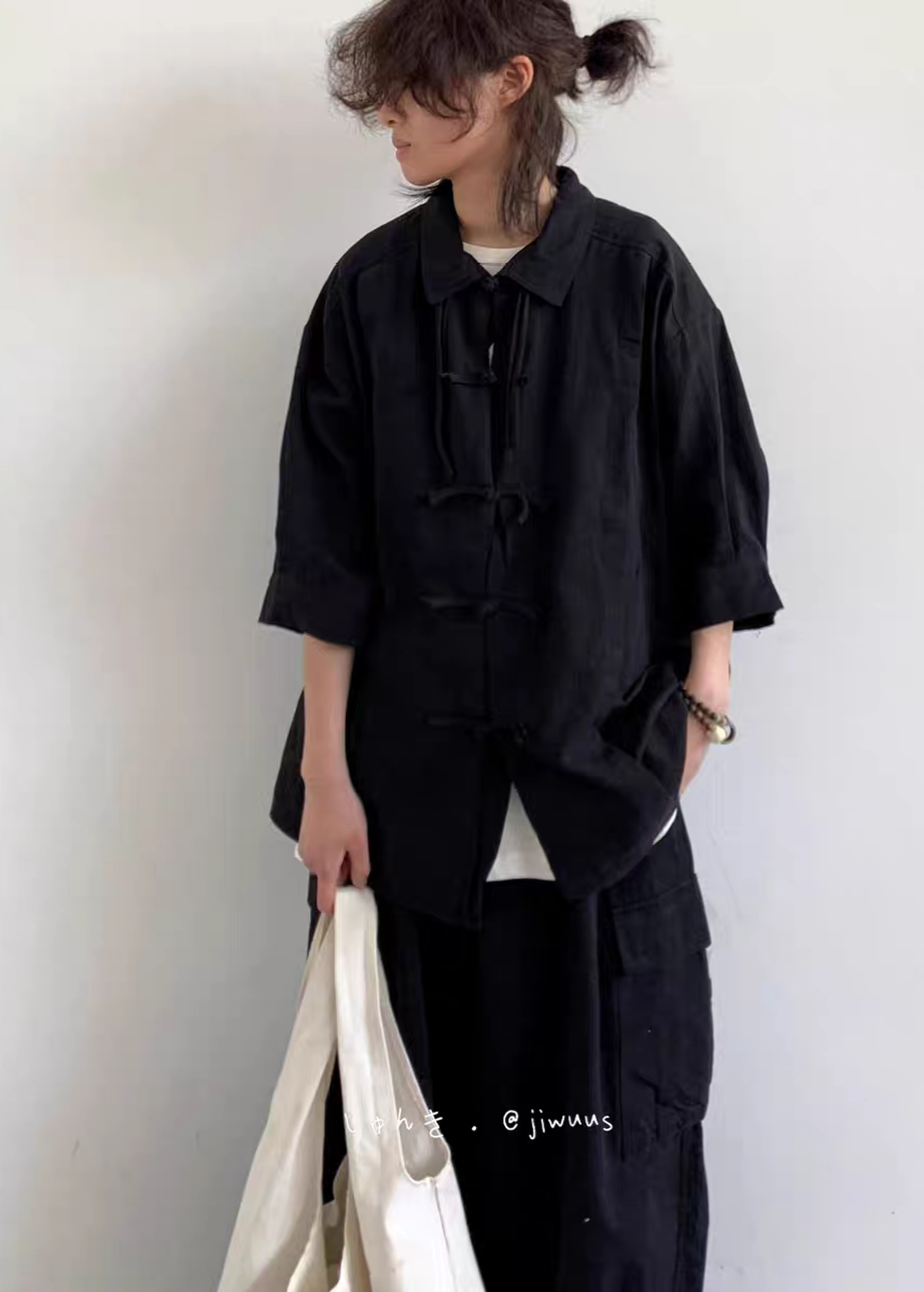 夏季新中式復古盤扣襯衫 純色寬鬆唐裝 男女國風短袖上衣
