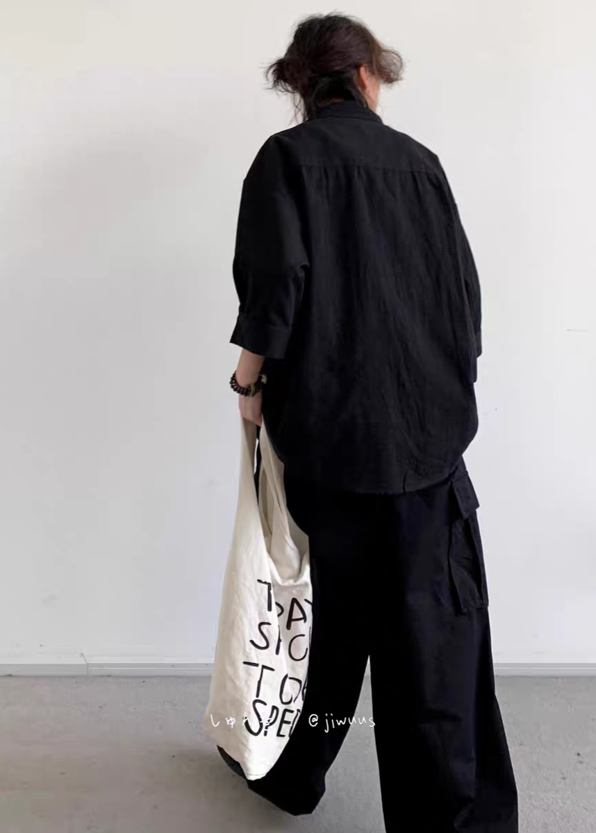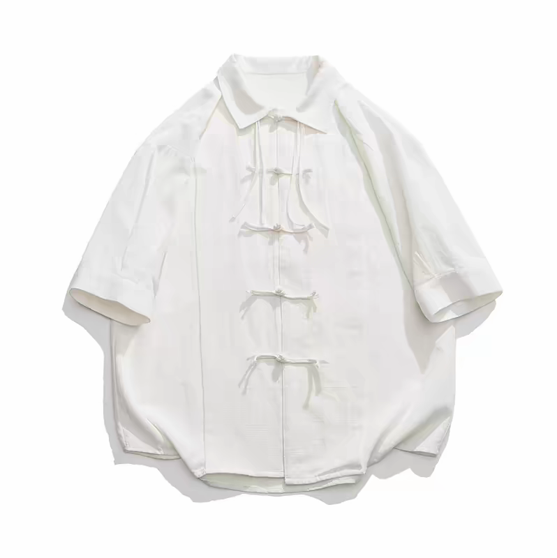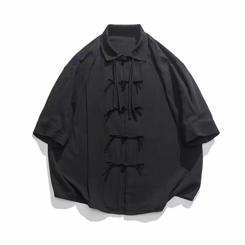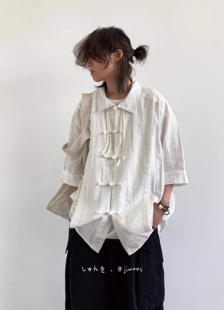 夏季新中式復古盤扣襯衫 純色寬鬆唐裝 男女國風短袖上衣