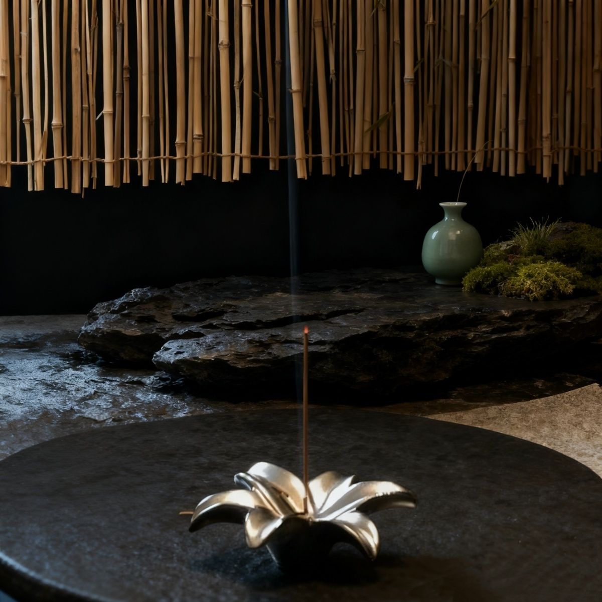 點上線香後,煙霧沿著花瓣緩緩升騰,