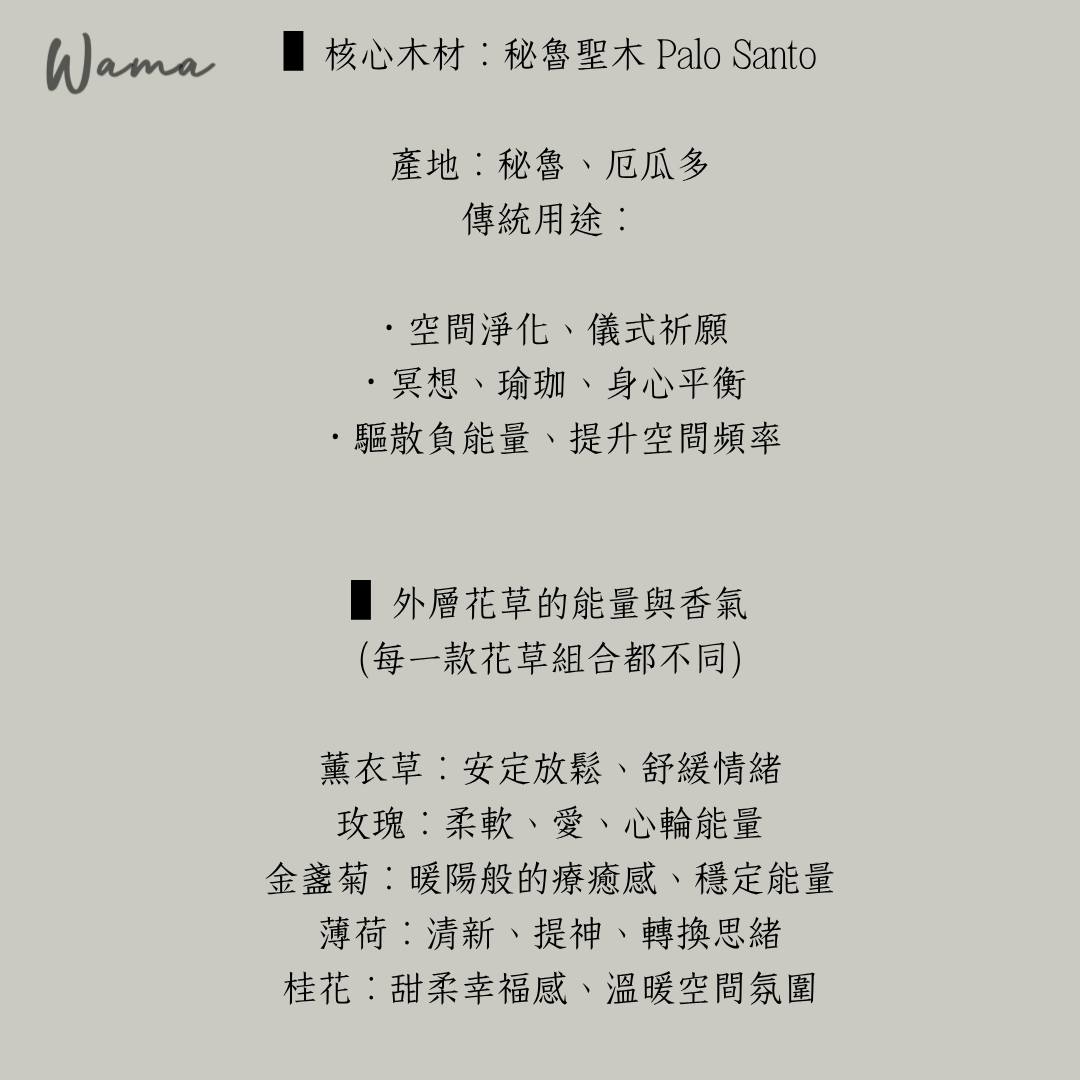 每一支聖木棒,都使用 天然特級 Palo Santo 搭配乾燥花材手工綁製。