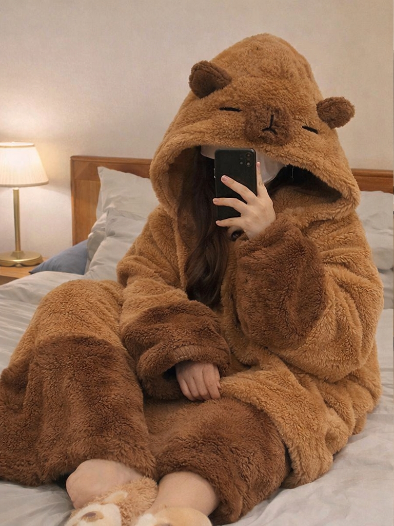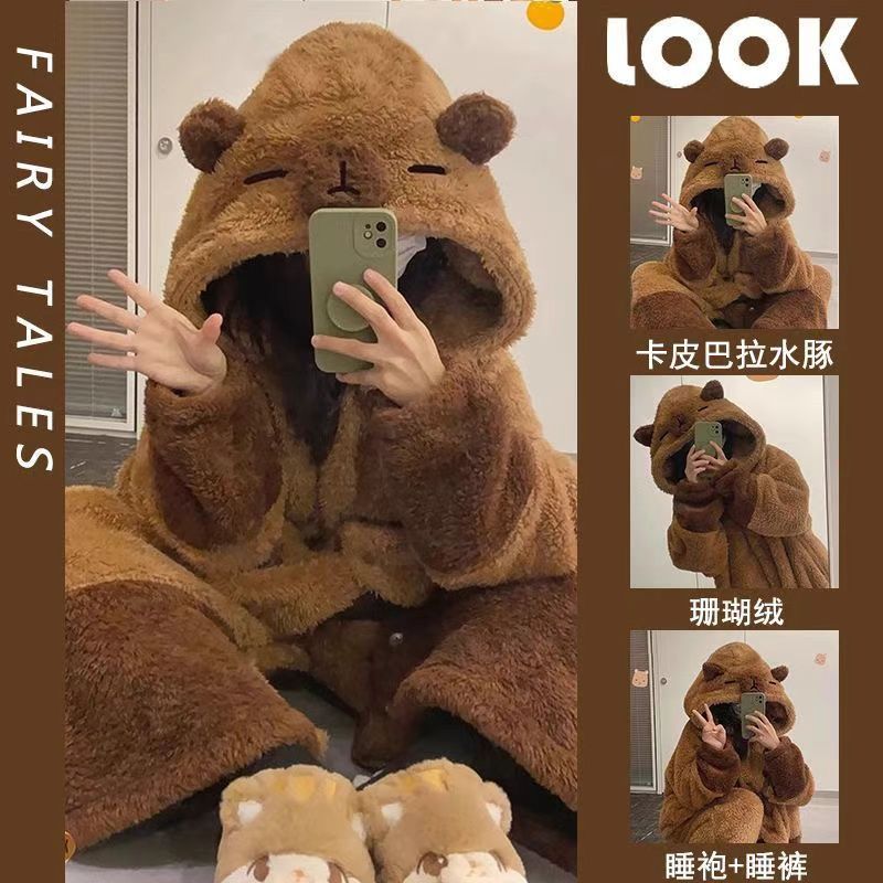 溫暖包圍卡皮巴拉 珊瑚絨冬季睡袍+褲子套裝