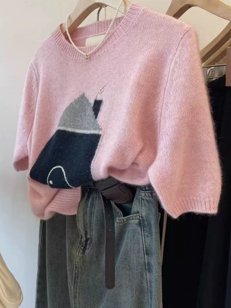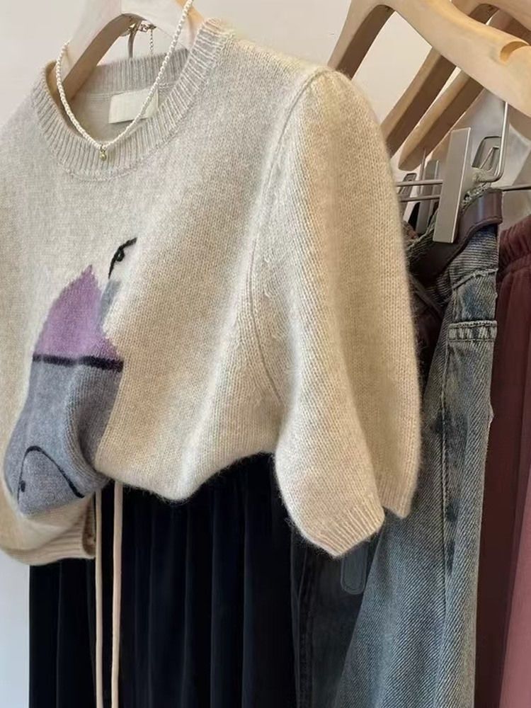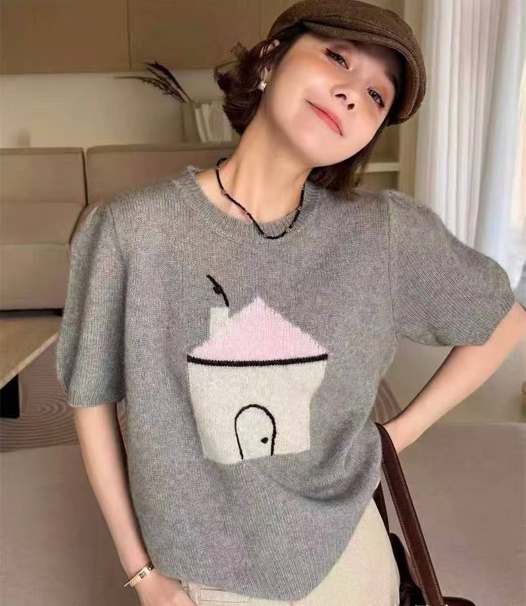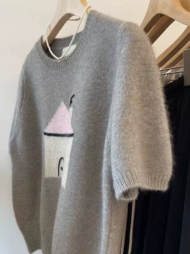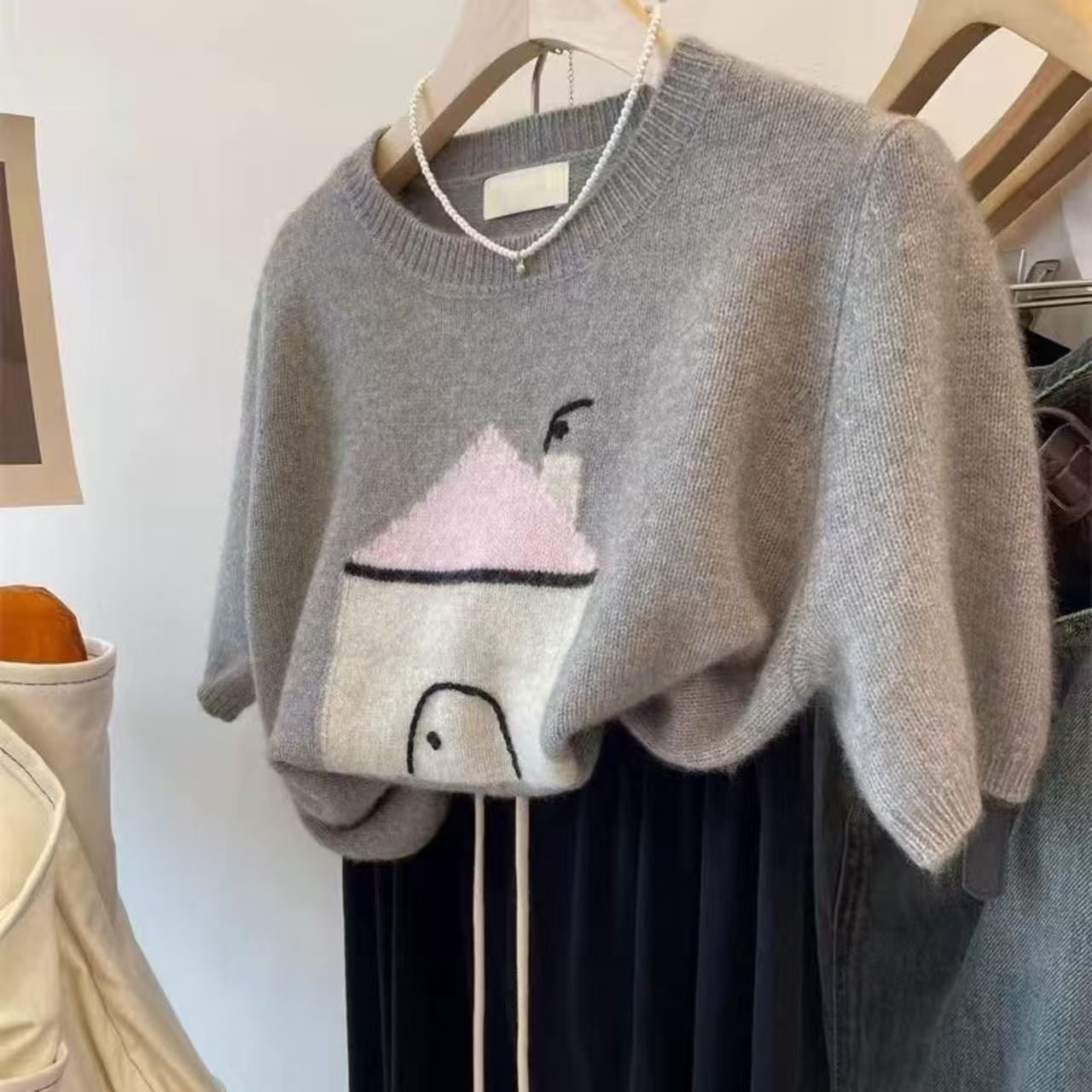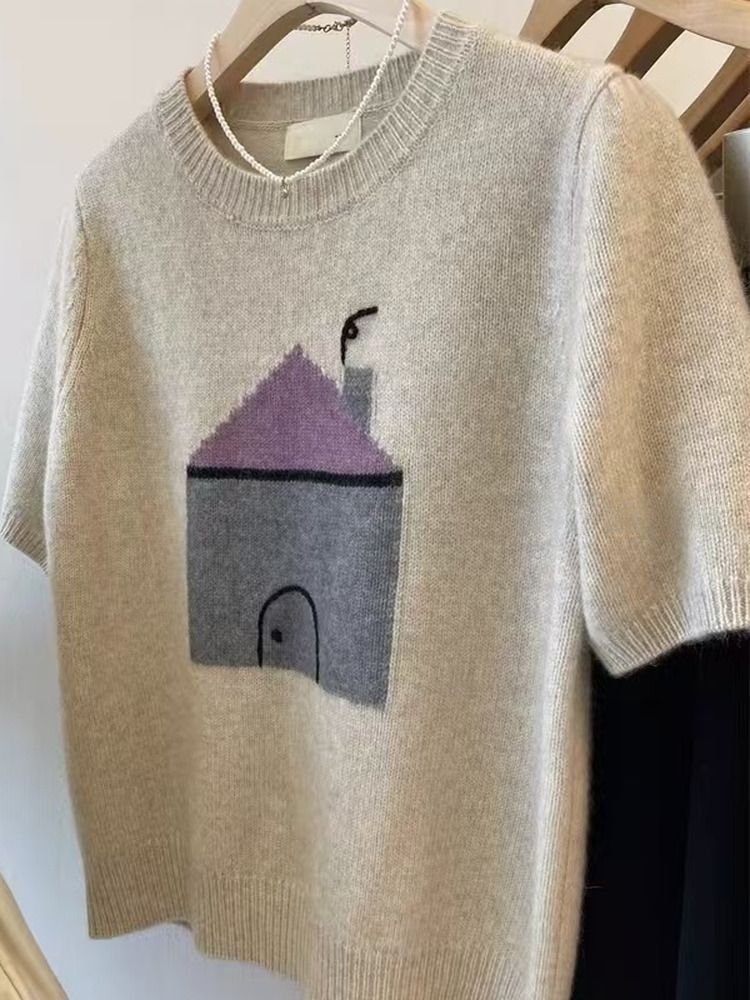 溫柔感爆棚!小屋插畫短袖針織毛衣