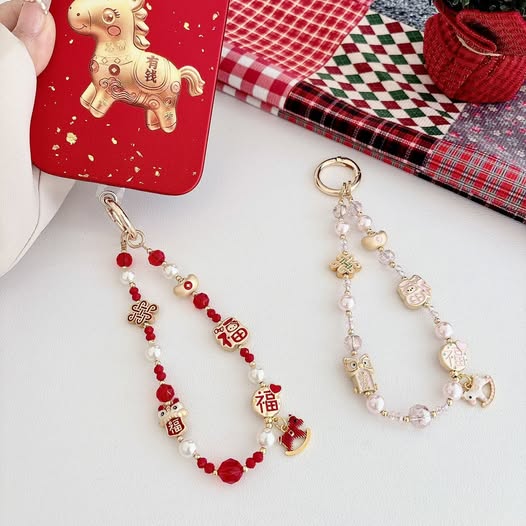 這款手機掛飾以紅色、白色與溫柔粉色串珠搭配可愛福字、元寶、小吊飾元素,