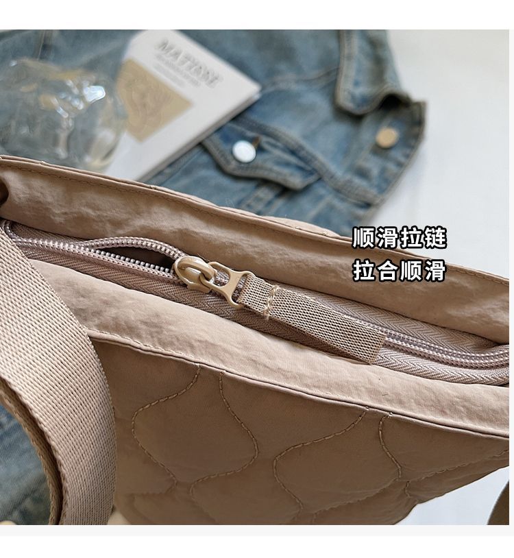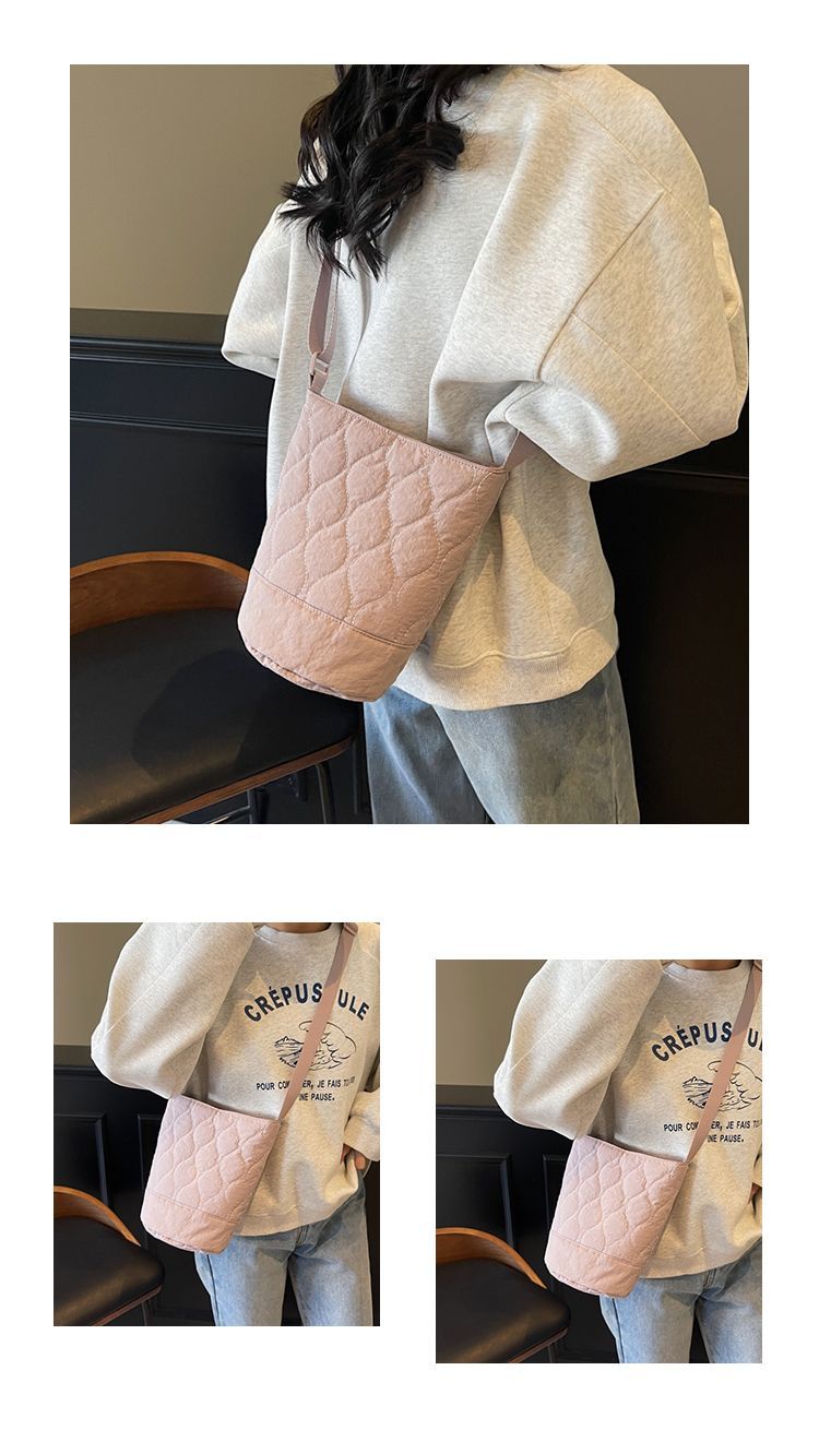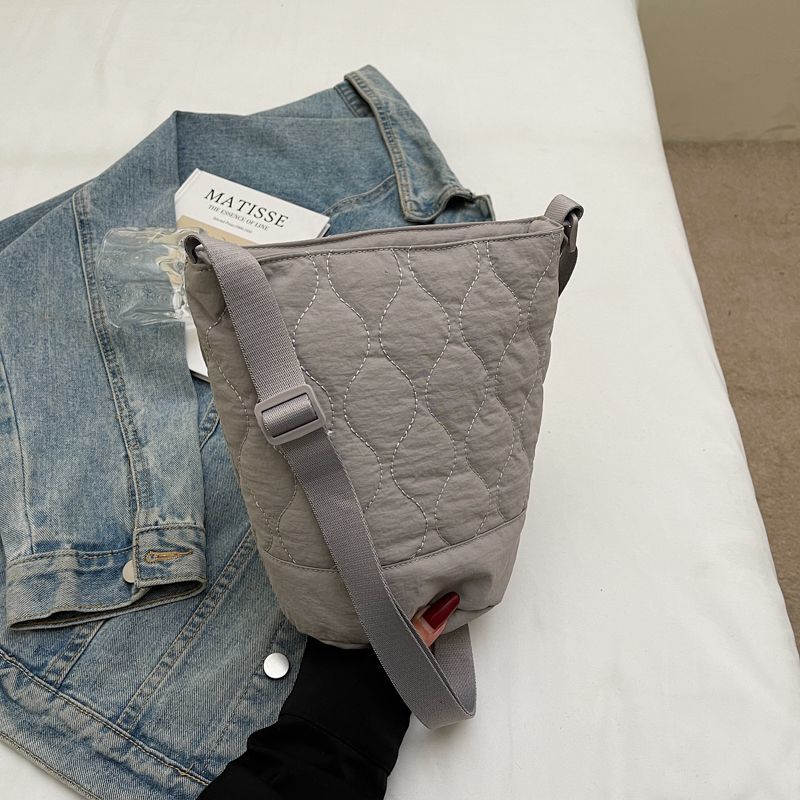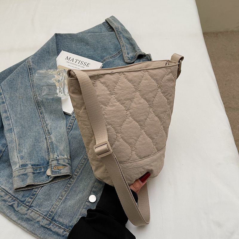 這款簡約菱格棉感水桶包,以輕盈布料搭配立體車線設計,帶出一種自然的鬆弛氛圍感。