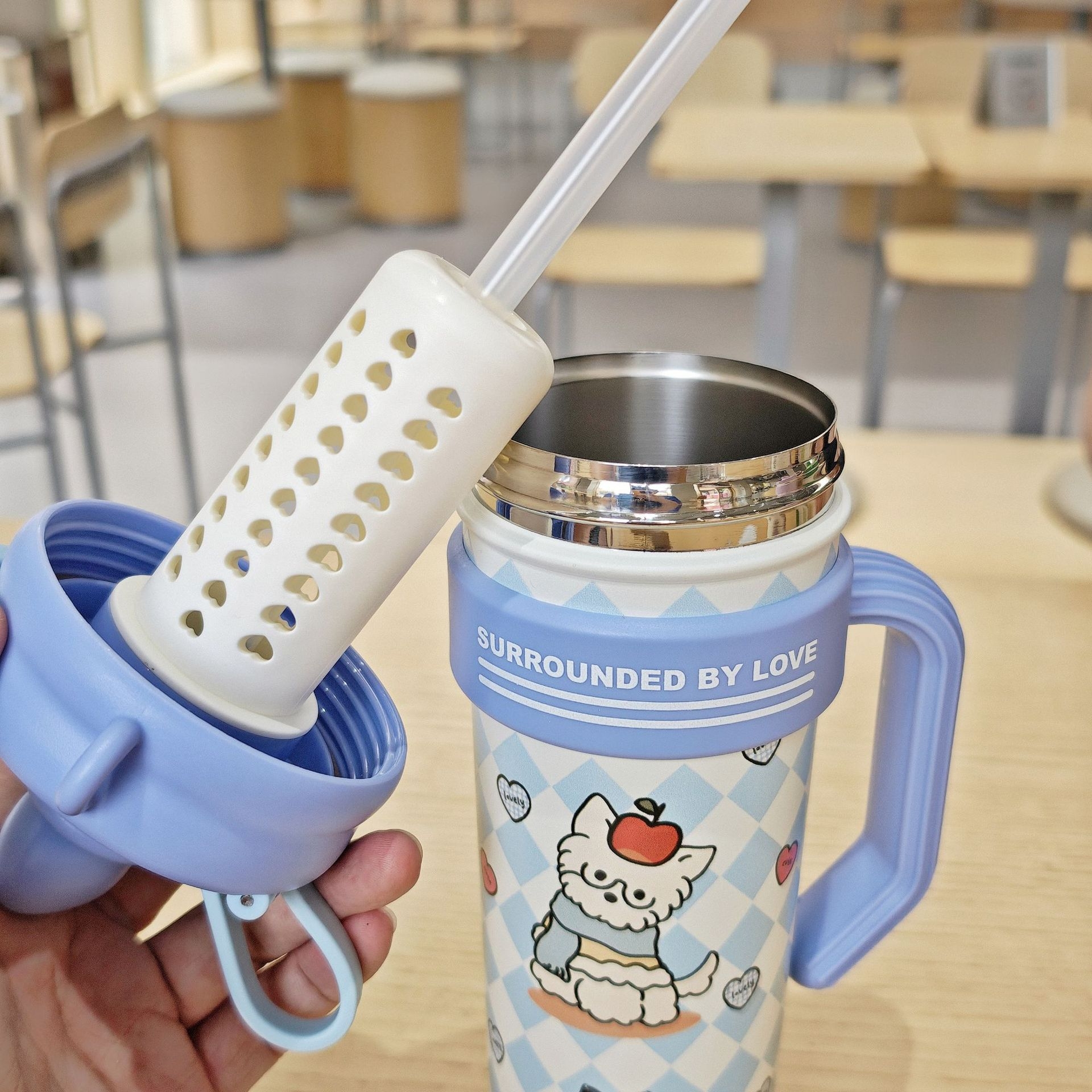 700ml萌萌卡通大容量手把保溫杯不鏽鋼真空茶隔吸管杯