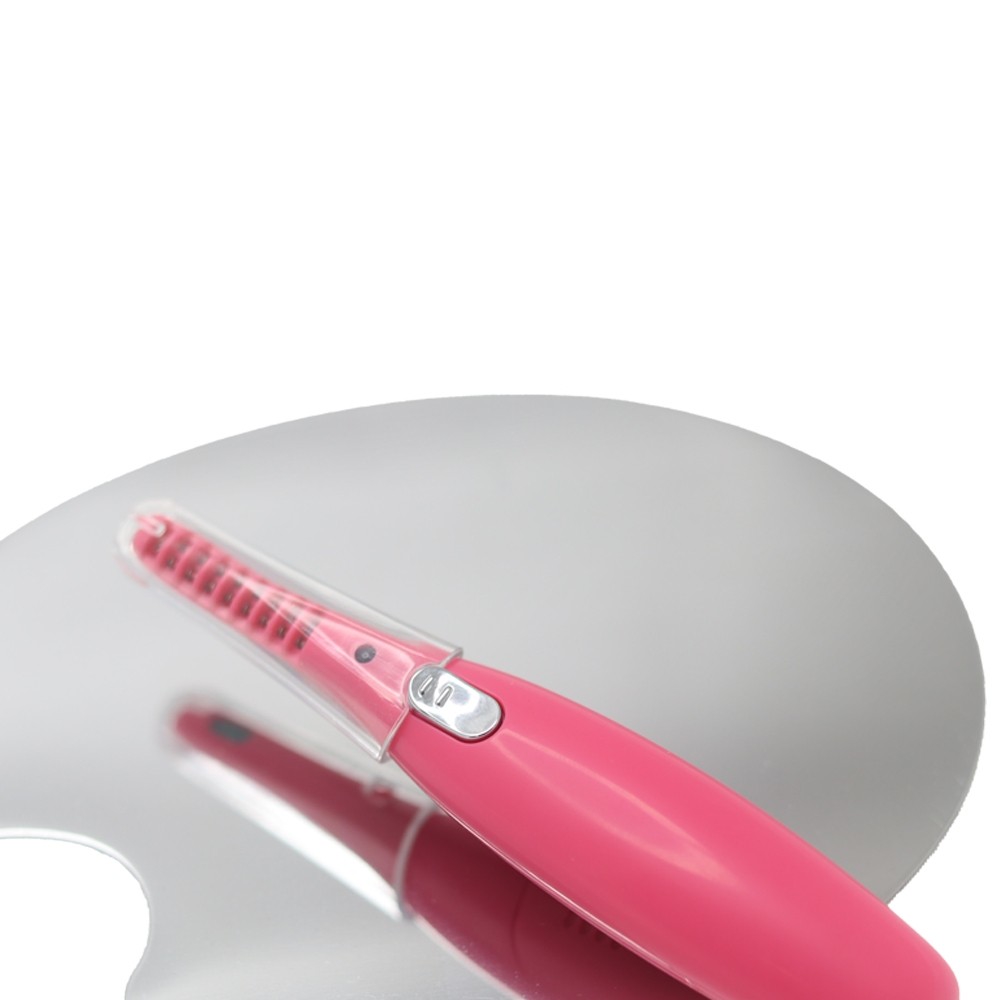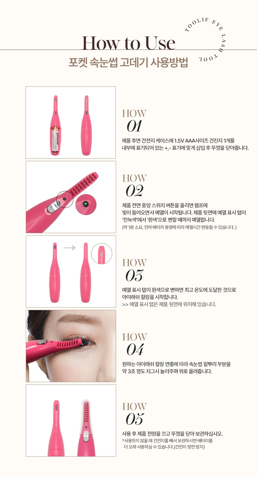 使用方法:打開電源預熱,等指示燈變白後即可先刷一次再用傳統睫毛夾,後續再刷一次並在根部按壓3秒,使用完畢後用紙巾擦拭並蓋上蓋子保管